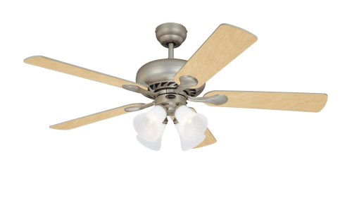 - 52-inch Swirl ceiling fan with a brushed pewter finish and five light maple / white reversible blades