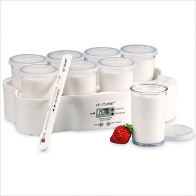 Make delicious yogurt the easy way with the Donvier electric yogurt maker. Using all-natural ingredients, this convenient device makes a total of 1.5-quarts (48-ounces) of light, creamy yogurt per batch. Electric timer has digital countdown display and automatic shutoff, with beeper sound at end of cycle. Features settings in half-hour increments, from 4 to 14 hours. Includes eight 6-oz.unbreakable, polycarbonate plastic jars, recipes and instructions..